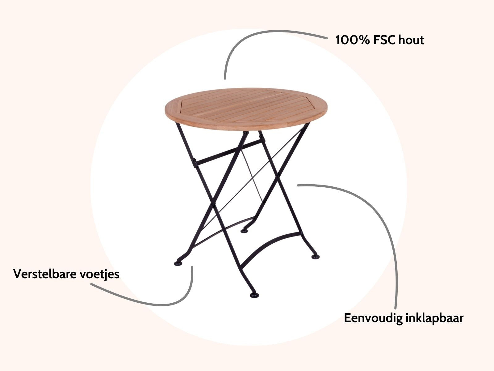 Deze hardhouten bistrotafel is handgemaakt en daardoor uniek. Het gebruikte acaciahout kan van kleur verschillen. Al onze houtproducten komen rechtstreeks uit de fabriek. Het kan daarom zijn dat er nog wat fijn zaagsel van het schuren is achtergebleven op het hout. Maak daarom voordat je gebruik maakt van onze teakhouten producten het product schoon met een nat doekje.