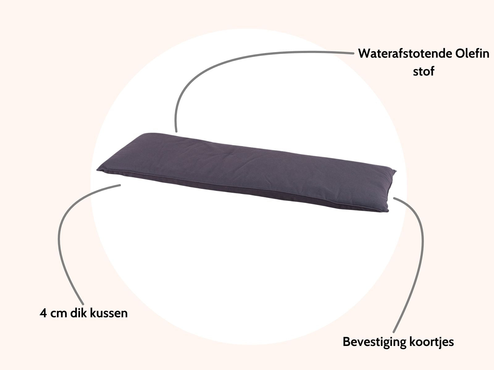 Ons bankkussen heeft koordjes, zodat je het kussen aan de rugleuning kunt bevestigen.
