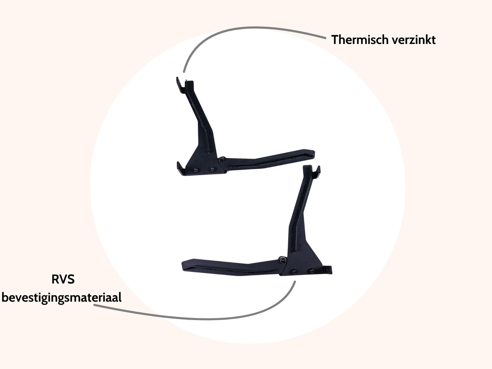 De set muurbeugels Jordaan zijn gemaakt uit ca. 8 mm dik mat zwart gecoat metaal dat eerst is verzinkt tegen roestvorming. Alle benodigde bouten en moeren zijn gemaakt uit roestvrijstaal.