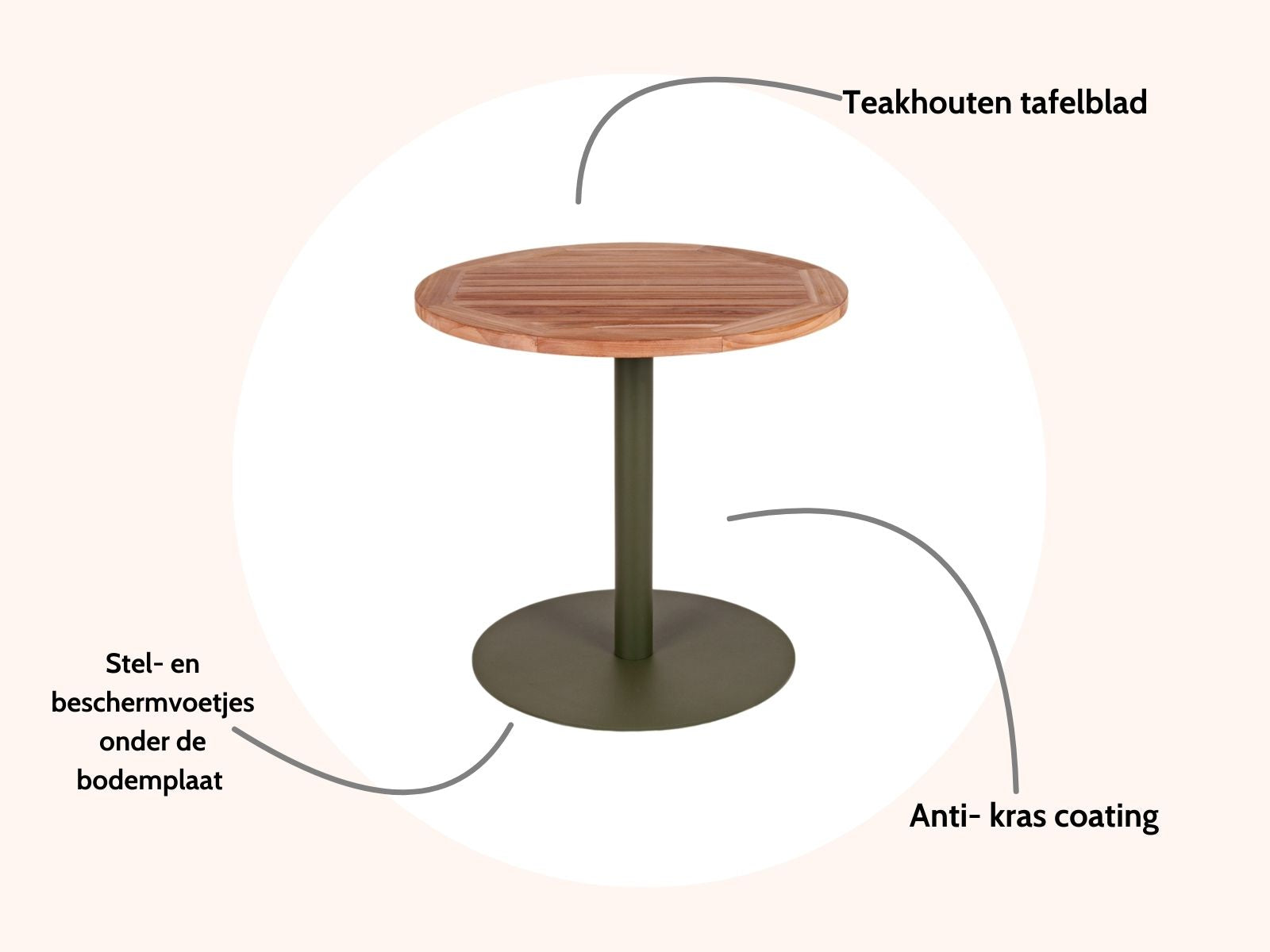 Het teak tafelblad is onbehandeld en zal buiten op den duur prachtig vergrijzen. Vind je dit niet mooi dan kun je het behandelen met onze hardhoutolie. Als je onze teak producten binnen gebruikt is het ook wijs om ze met olie te behandelen. Je voorkomt dan grotendeels vlekvorming van glazen of pannen.