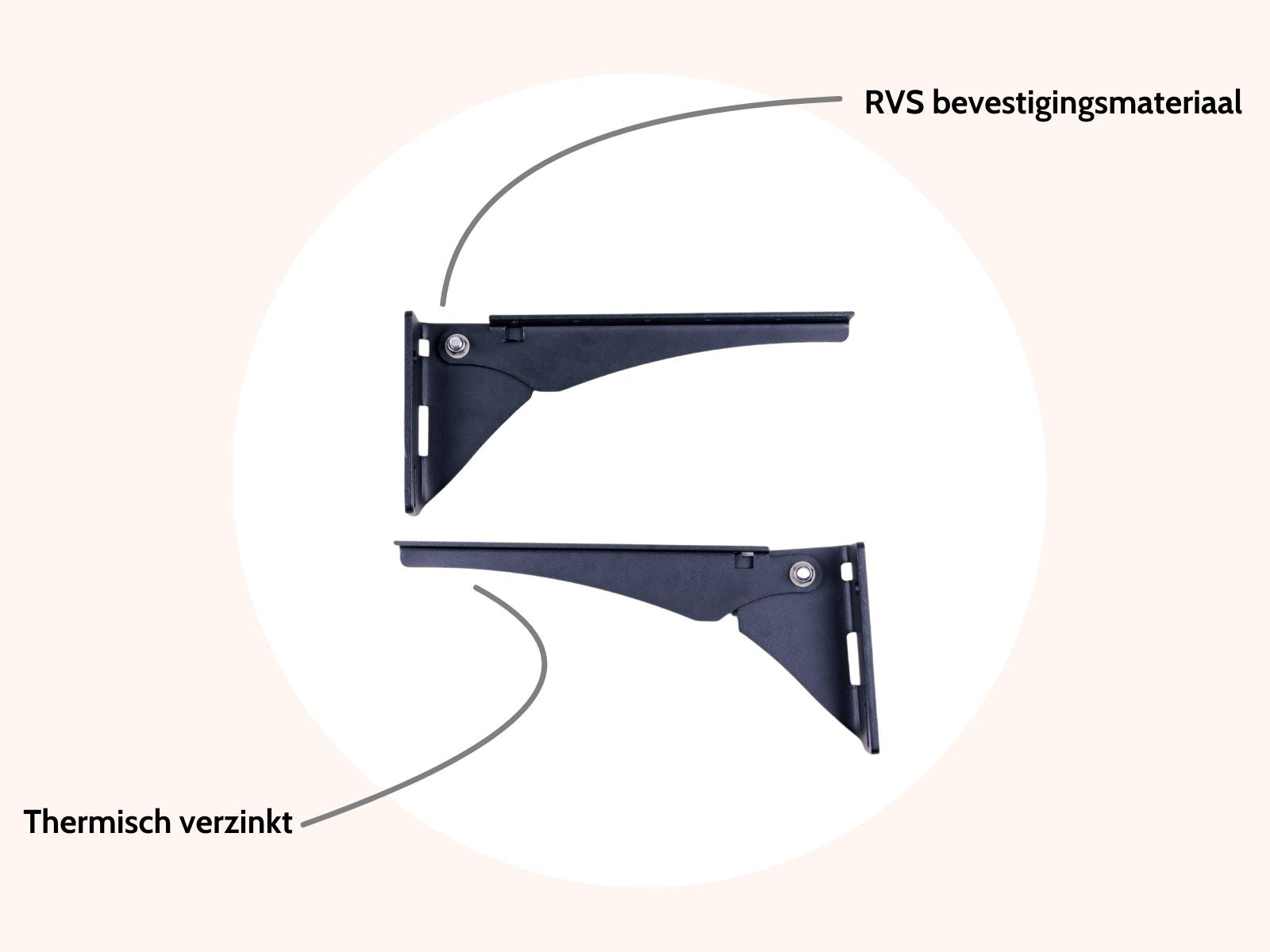 De set muurbeugels Jordaan zijn gemaakt uit ca. 8 mm dik mat zwart gecoat metaal dat eerst is verzinkt tegen roestvorming. Alle benodigde bouten en moeren zijn gemaakt uit roestvrijstaal.