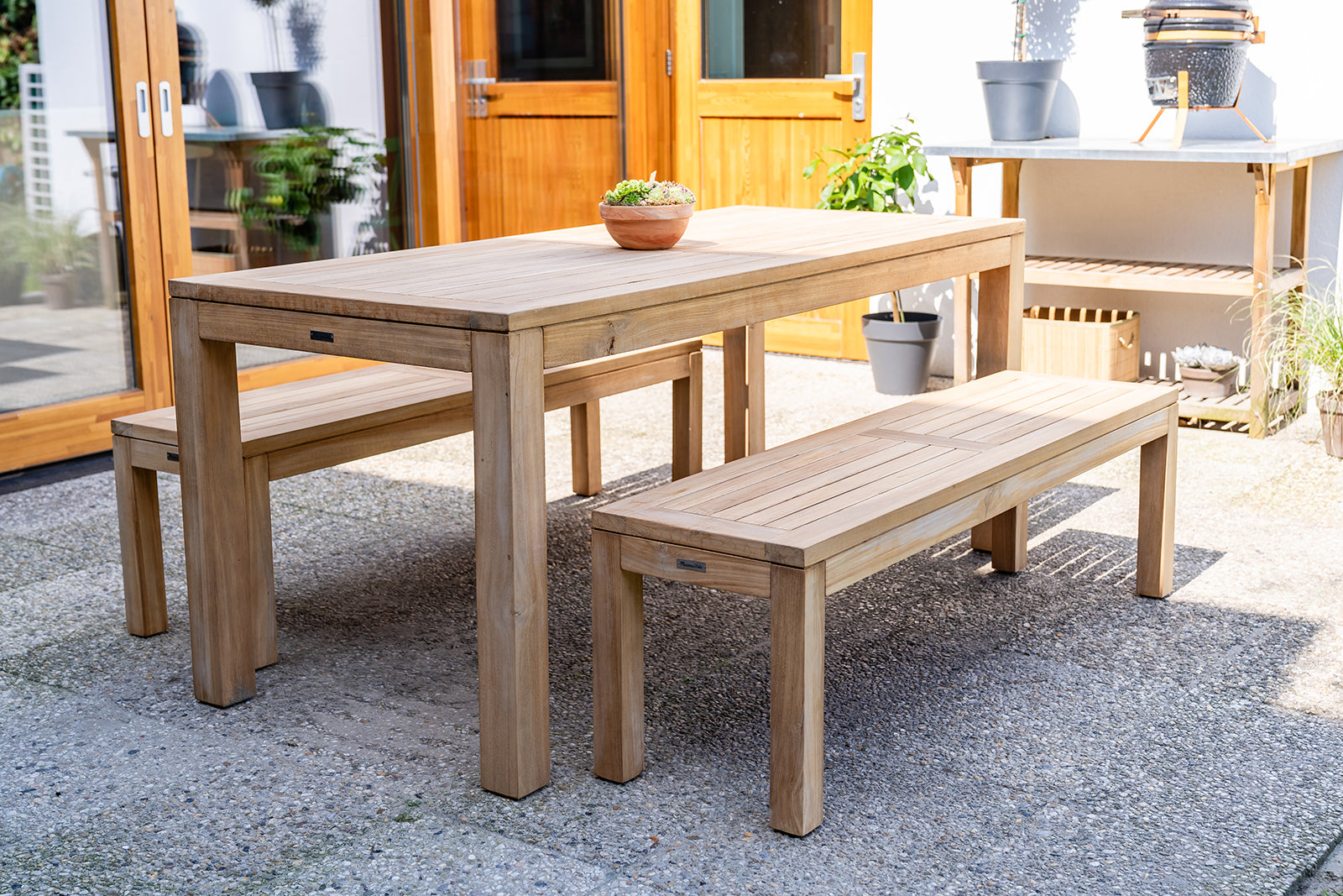 Ons teak is onbehandeld en zal buiten prachtig vergrijzen. Vind je dit niet mooi dan kun je het behandelen met MaximaVida hardhout olie. Door het teak met olie te behandelen heb je ook minder last van vlekvorming van bijvoorbeeld glazen of bloempotten.