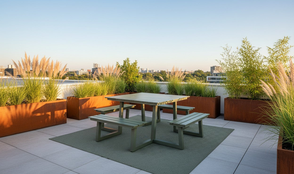 Doordat de tafel wordt geleverd in een bouwpakket is hij eenvoudig te plaatsen op verdiepingen en dakterrassen.