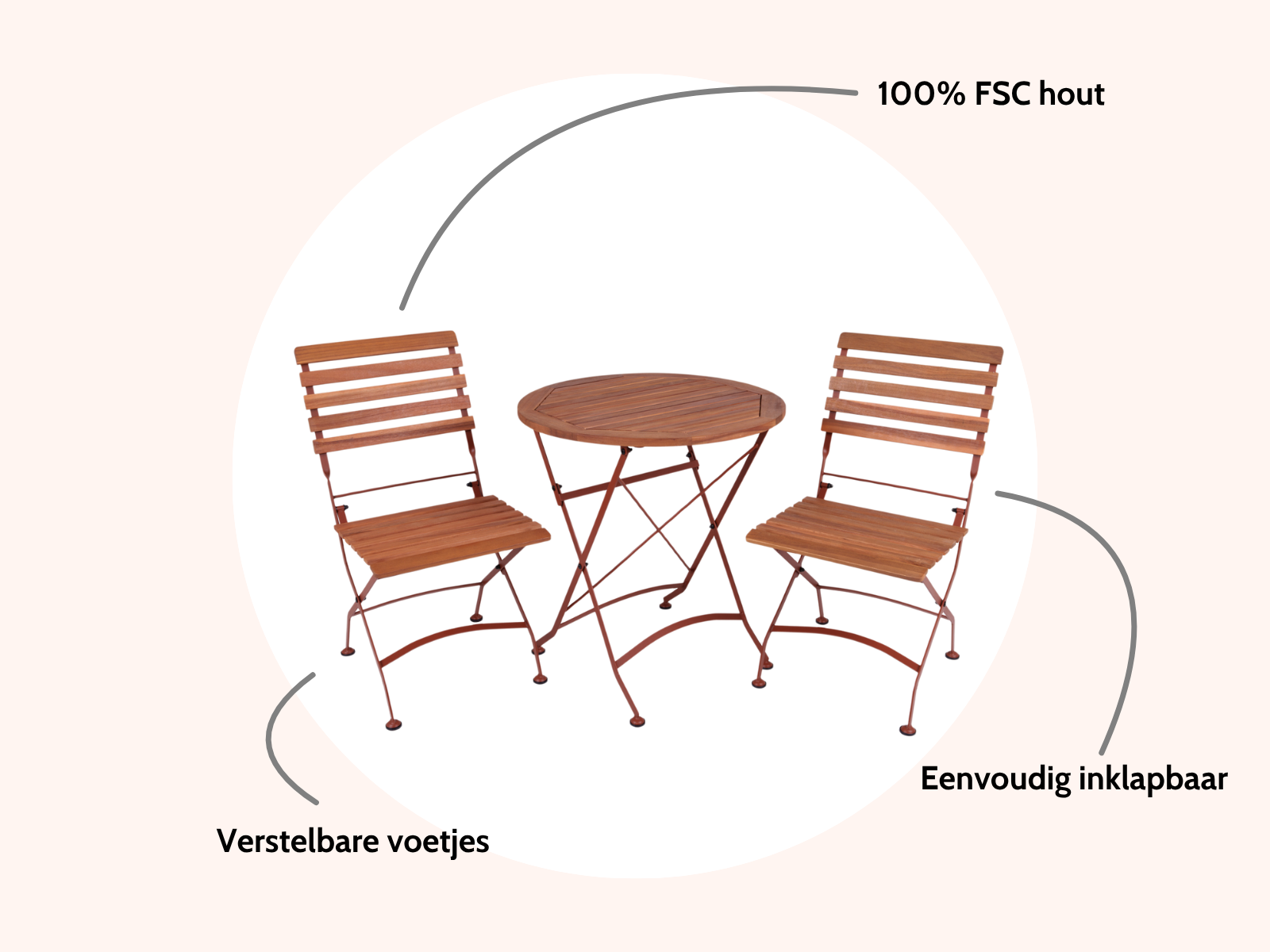 De stoelen hoef je niet op te bouwen. Klap ze open en je kunt zitten. Bij de tafel moet je het onderstel aan het blad monteren met slechts 4 boutjes. De totale montagetijd is ongeveer 10 minuten.