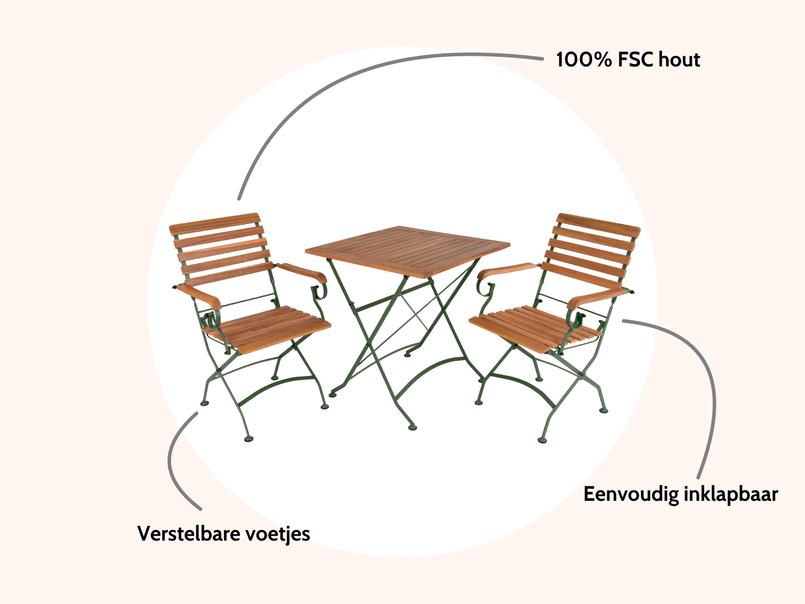 Deze hardhouten bistroset is handgemaakt en daardoor uniek. Het gebruikte acaciahout kan van kleur verschillen. Ons acaciahout is behandeld met olie en zal buiten prachtig vergrijzen. Vind je dit niet mooi dan kun je het behandelen met MaximaVida hardhout olie.
